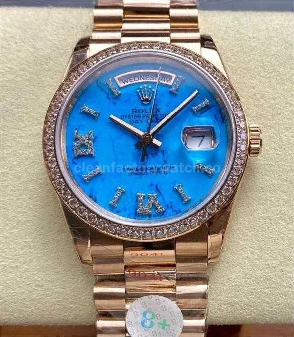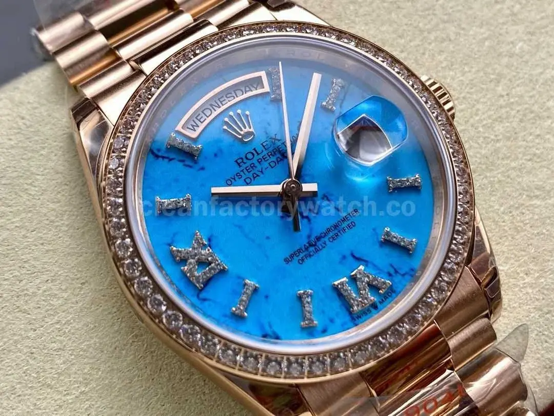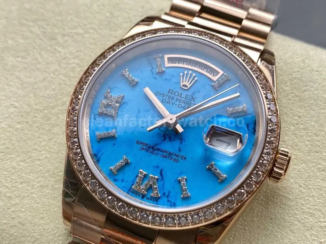 8+ Factory Counterweight Rolex Day-Date 128345RBR-0064 36mm Diamond Bezel Full Rose Gold Roman Numerals Diamond Blue Dial