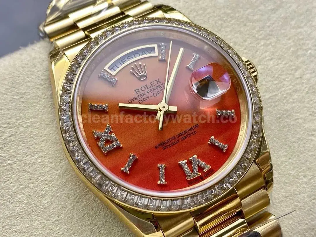 8+ Factory Counterweight Rolex Day-Date 128348RBR-0049 36mm Diamond Yellow Gold Bezel Full Yellow Gold Diamond Roman Numerals Orange Gradient Dial