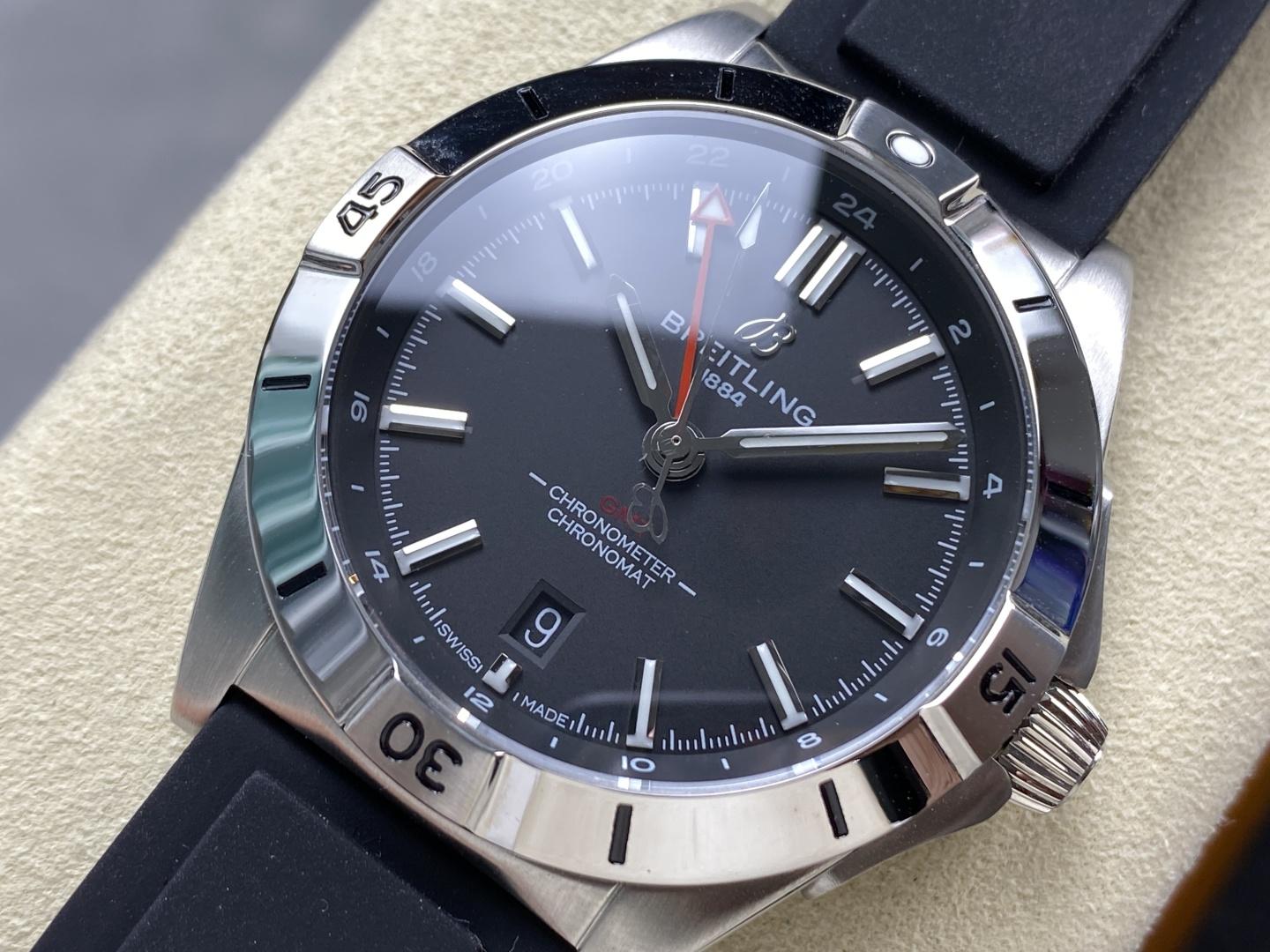 Matte black dial with red-tipped GMT hand for tracking a second time zone