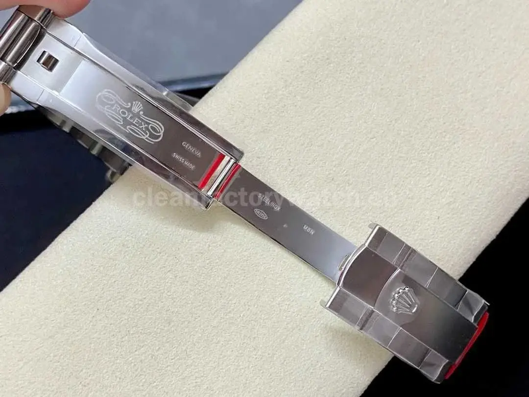 The hands are perfectly proportioned, with a smooth central seconds sweep. At 3 o’clock, the Cyclops date magnifier is fully replicated, featuring bold, clear fonts with correct spacing and thickness. The quick-set date function operates smoothly, just like the genuine watch.