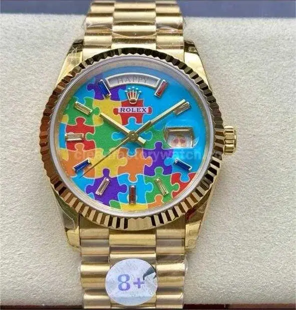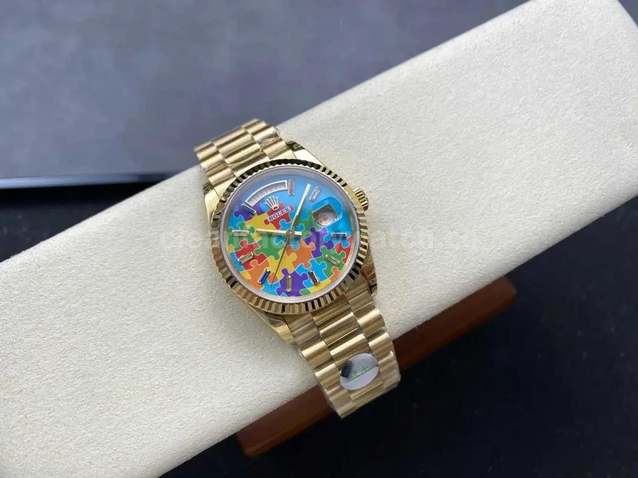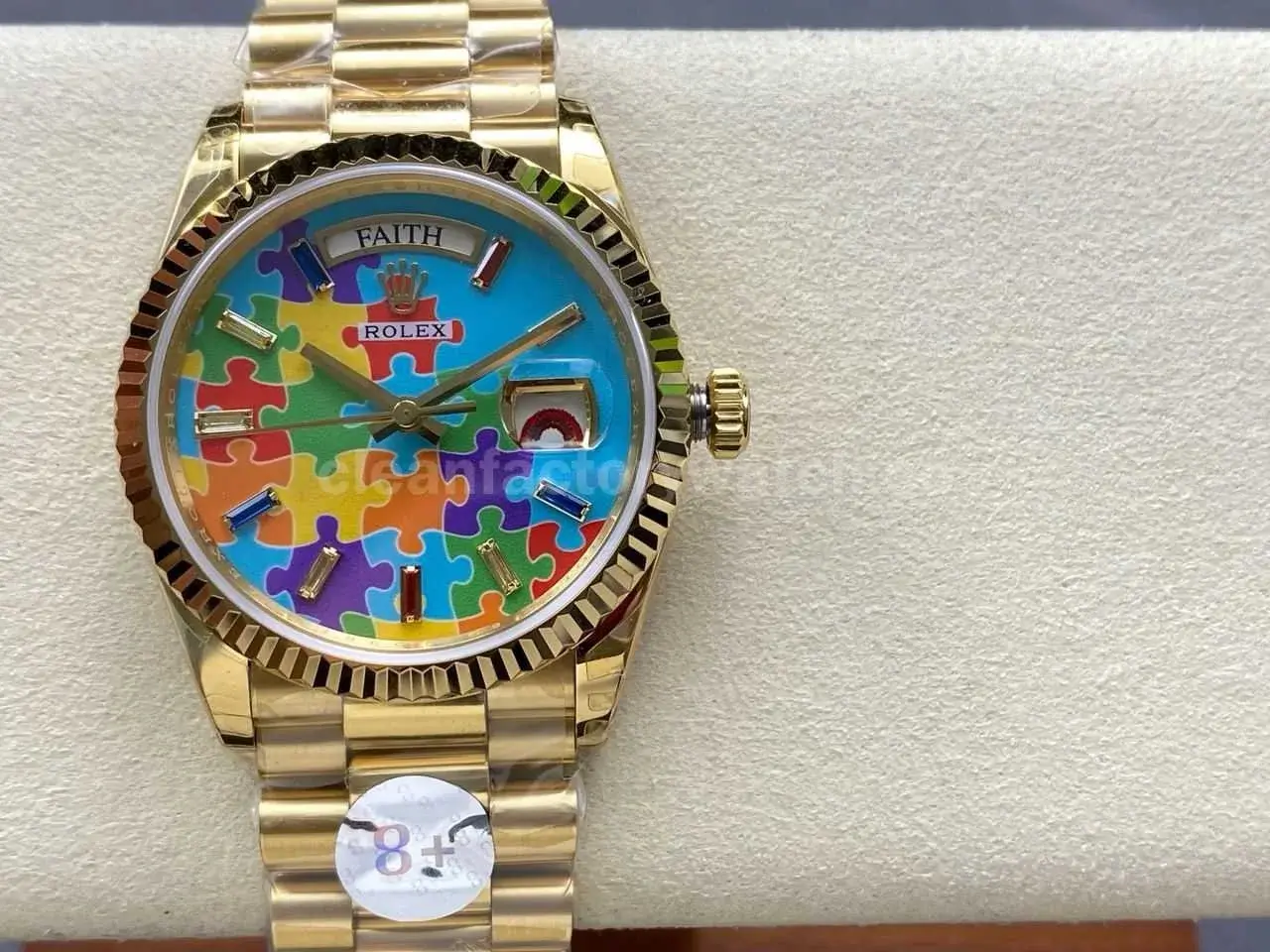 8+ Factory Counterweight Rolex Day-Date 128238-0106 36mm Full Yellow Gold Color Baguette Puzzle Blue Dial