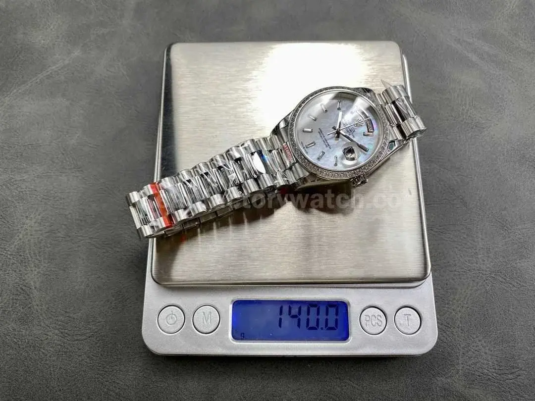 8+ Factory Counterweight Rolex Day-Date 128349RBR-0049 36mm Diamond Bezel Full 904L Baguette Diamond Mother Of Pearl Dial