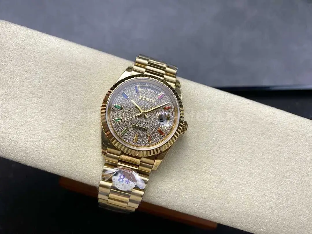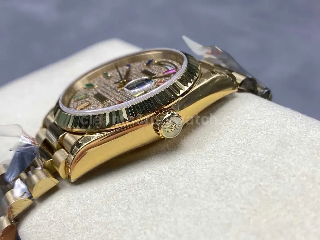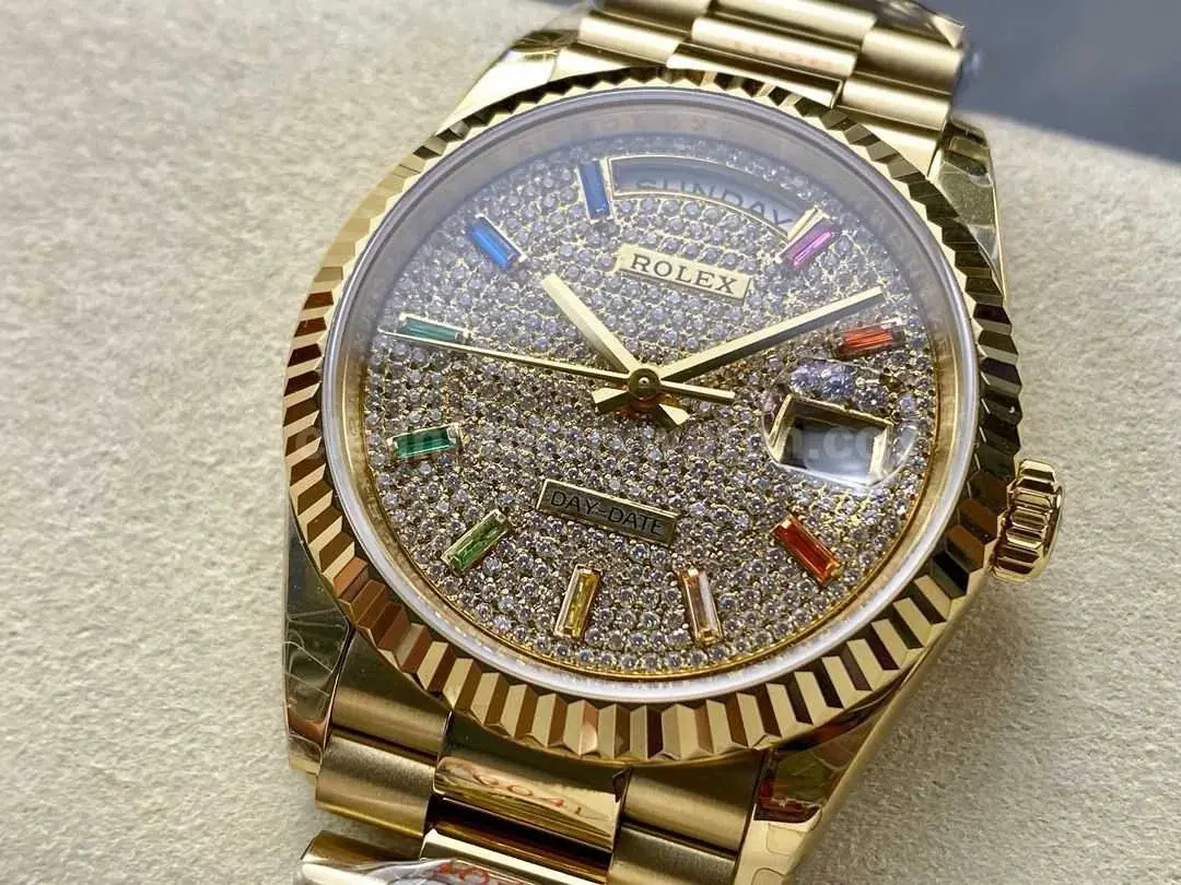 8+ Factory Counterweight Rolex Day-Date 128238-0051 36mm Full Yellow Gold Baguette Diamond Yellow Gold Dial